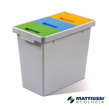 Beholder med to flyttbare skillevegger. Lokk med tre kombinerte åpninger. Lokkene ligger på en ramme som sikrer posenes posisjon. Integrerte håndtak på begge sider av beholderen.