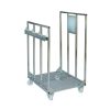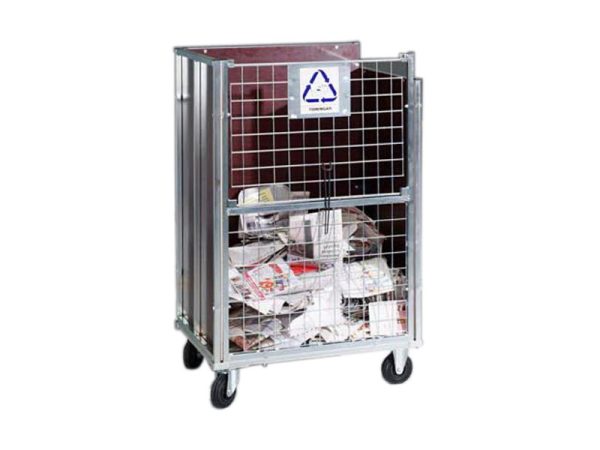 Rullecontainer for oppsaming av papir. Bunn og 3 sider kledd med plywood, 1 side med gitter som er nedfellbar til halve høyden. 4 hjul, hvorav 2 med sving. Merkeplate for dekal.